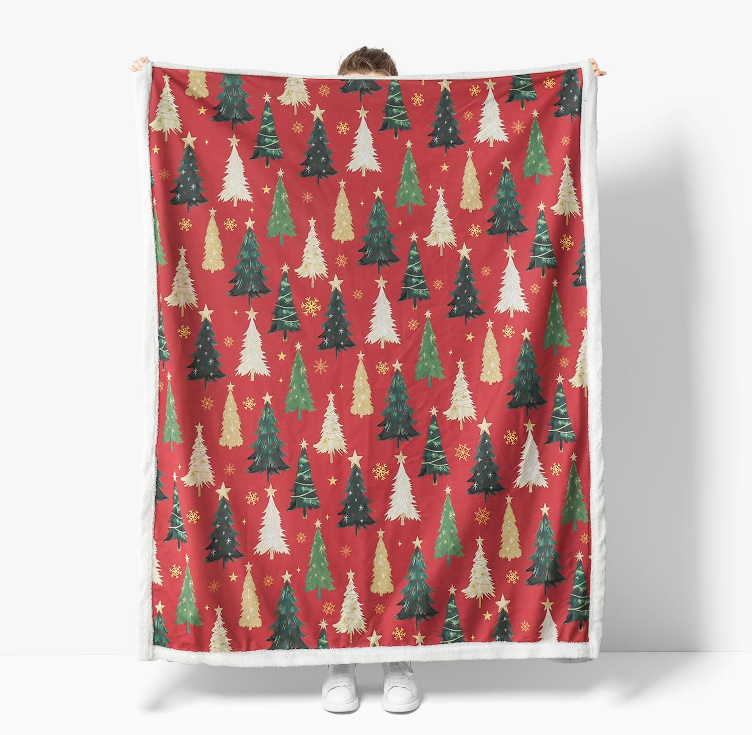 The blanket features a lively red background adorned with Christmas trees in shades of green, gold, and white, accented with golden snowflakes for extra festive sparkle. The vibrant design captures the joyful spirit of the holiday season, making it a stunning centerpiece for your seasonal décor.